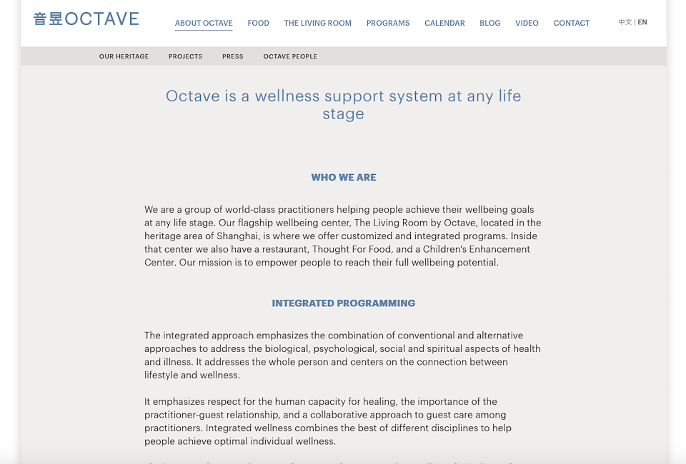 IMC Octave is the real-estate arm of IMC Group, a family-run Chinese conglomeration that began in 1949 as a shipping company. Led by visionary brothers Calvin and Fred Tsao, IMC Octave aims to “balance agrarian and urban societies” with a series of built environments that manage China’s rapid urban growth through ideals of wellness, nature, interpersonal dynamics, and self-actualization. To bring the ideological foundation of IMC Octave to life for a breadth of consumer audiences, I created a messaging strategy and framework to serve as the basis of the company’s brand and marketing communications. The work was completed in collaboration with Pentagram NY as part of a larger brand identity engagement.