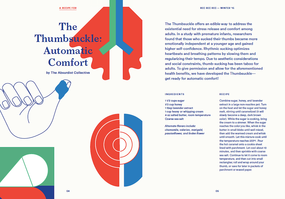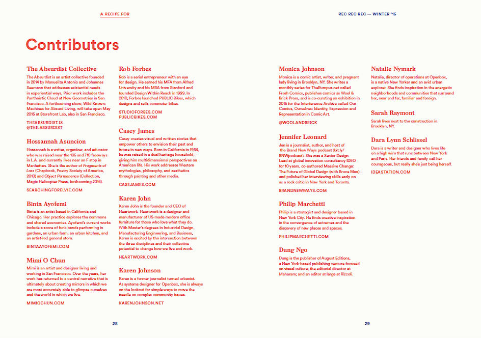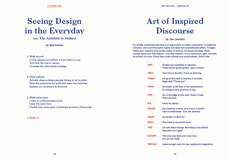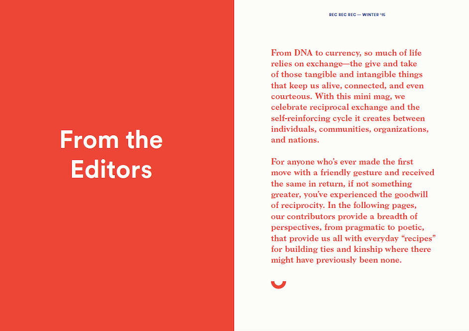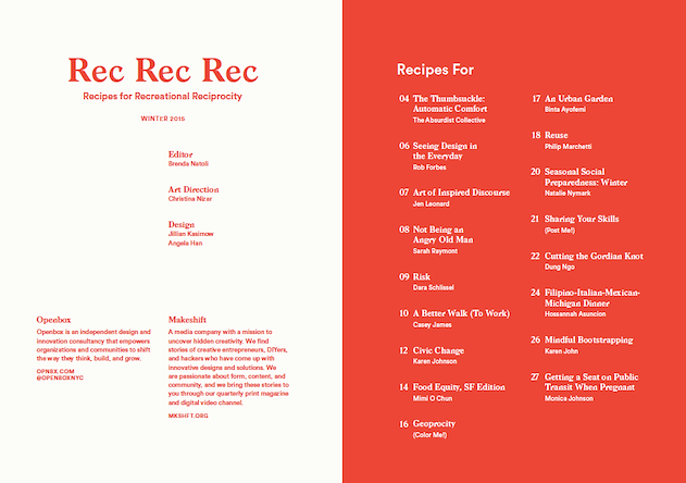“Recipes for Recreational Reciprocity," or "Rec Rec Rec," is a 24-page mini-mag created for the Winter 2015 issue of Makeshift magazine. As the creative conceptor and editor, I originated the theme of social reciprocity to align with both the magazine’s Harvest issue and Openbox’s value proposition, Design for Community. Contributors responded to a brief looking for "recipes”—both utilitarian and whimsical—for how to co-exist through positive actions. The 16 final contributors included writers, innovators, founders, and artists such as master maker Mimi O Chun, DWR and Public Bicycles founder Rob Forbes, and “Massive Change” co-author Jen Leonard. “Rec Rec Rec” was distributed internationally to more than 150 shops through Barnes & Noble and Chapters/Indigo.