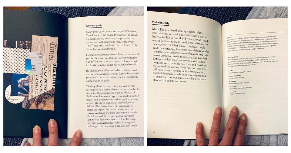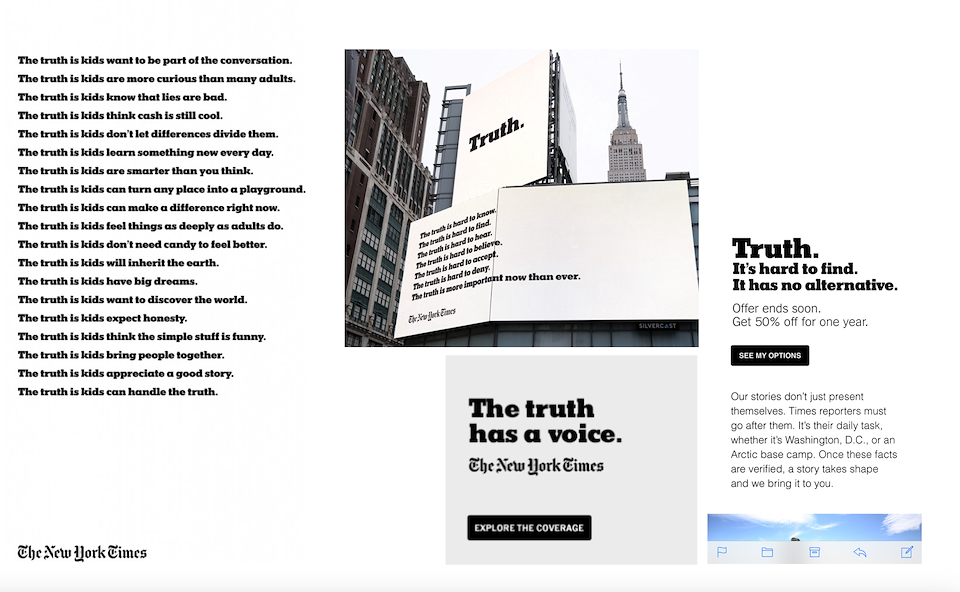 As the first Head of Brand Voice at The New York Times, I formalized a common tone of voice to be employed across newsroom and marketing efforts. The framework and accompanying tactics embodied the brand’s long-held journalistic excellence while making room for more recent media behaviors and consumer expectations. This strategy was evidenced across NYT brand and product marketing touch points, content design, and advertising campaigns, most notably the award-winning “Truth” series. It was also fully exposited in the company’s first Brand Guide, which I wrote in collaboration with the company’s design leadership.
